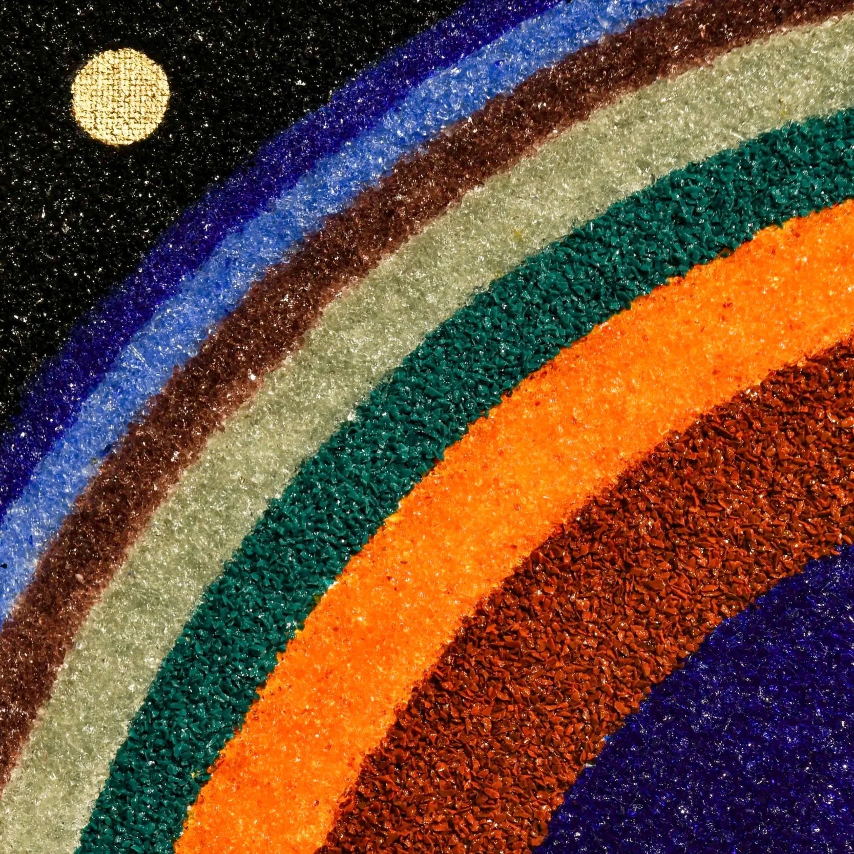 Bands of fused glass crystal create a luminous architecture of color surrounding a dark central void, suggesting orbital structures, gravitational relationships, and layered planes of existence.