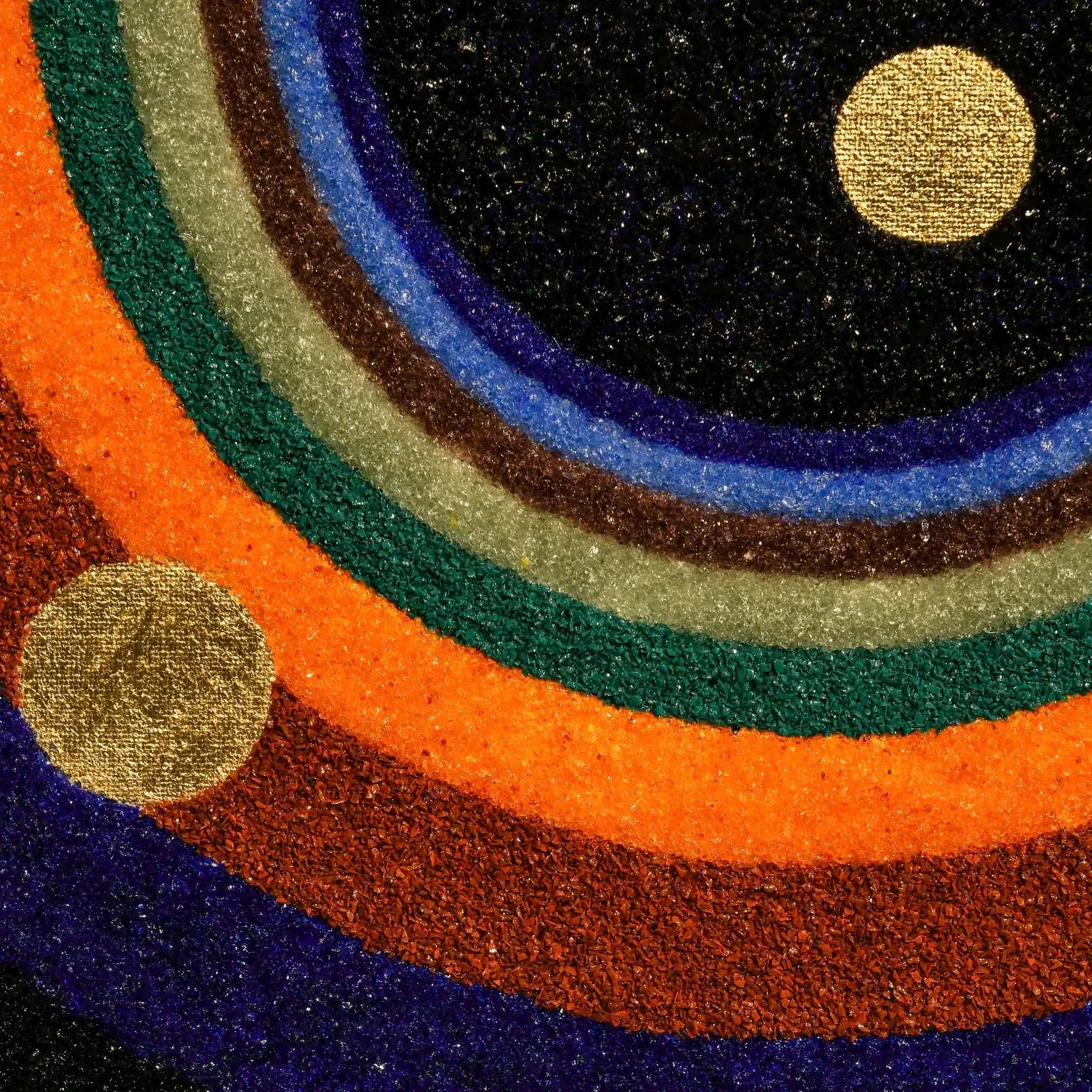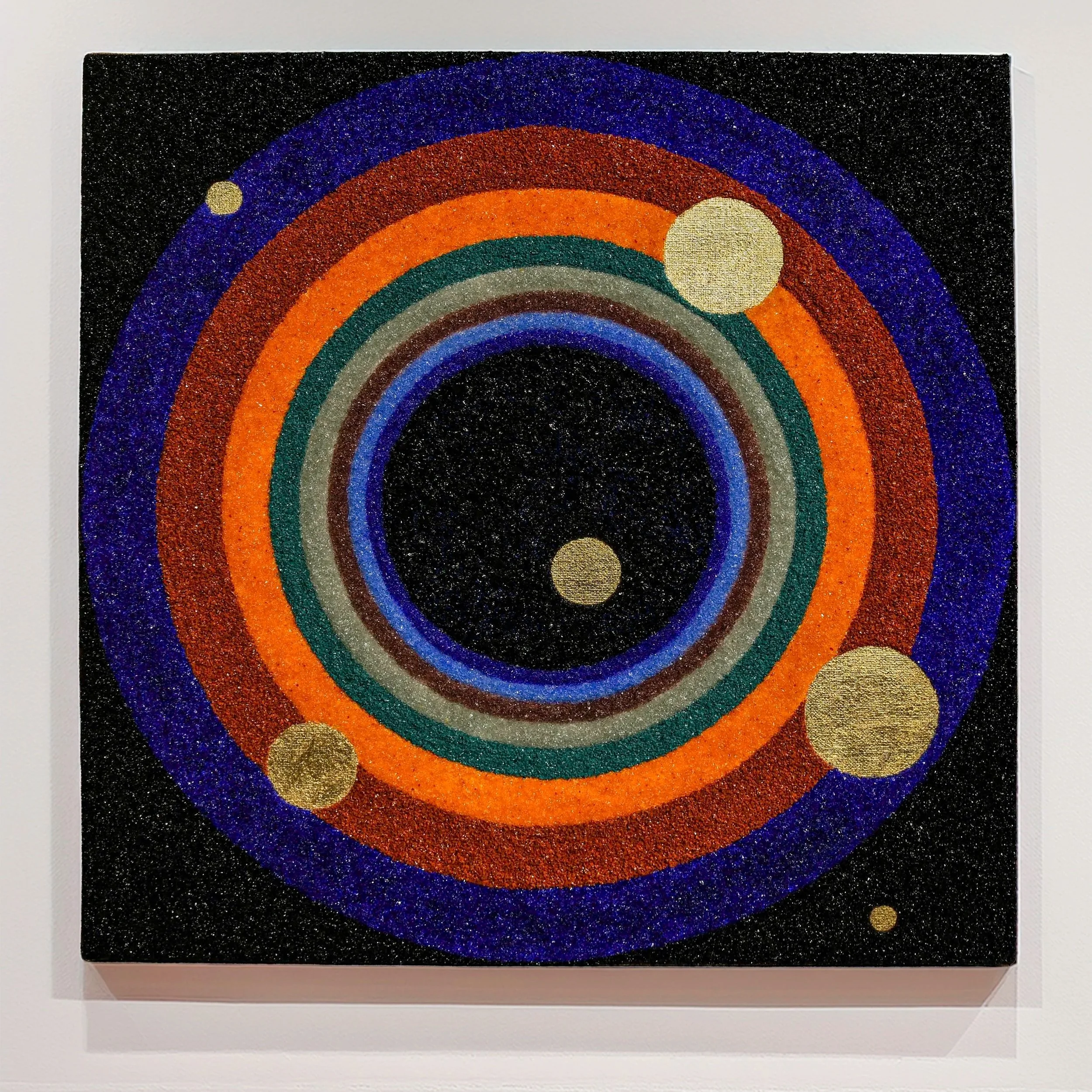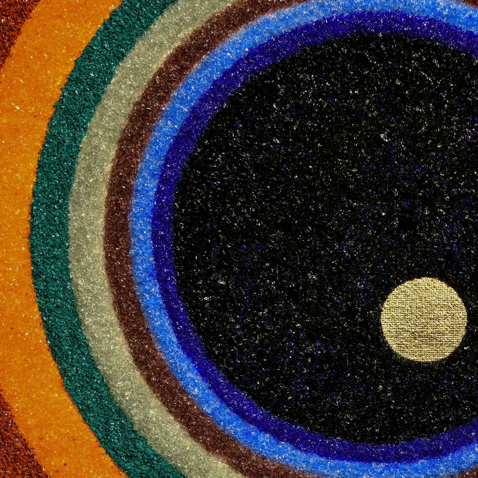 Orbital Field II continues KalaRara Roma’s exploration of luminous spatial structures through the MicroCristallo Fusione technique. Concentric chromatic bands radiate from a dark central field, forming a layered composition that evokes celestial movement and gravitational relationships.