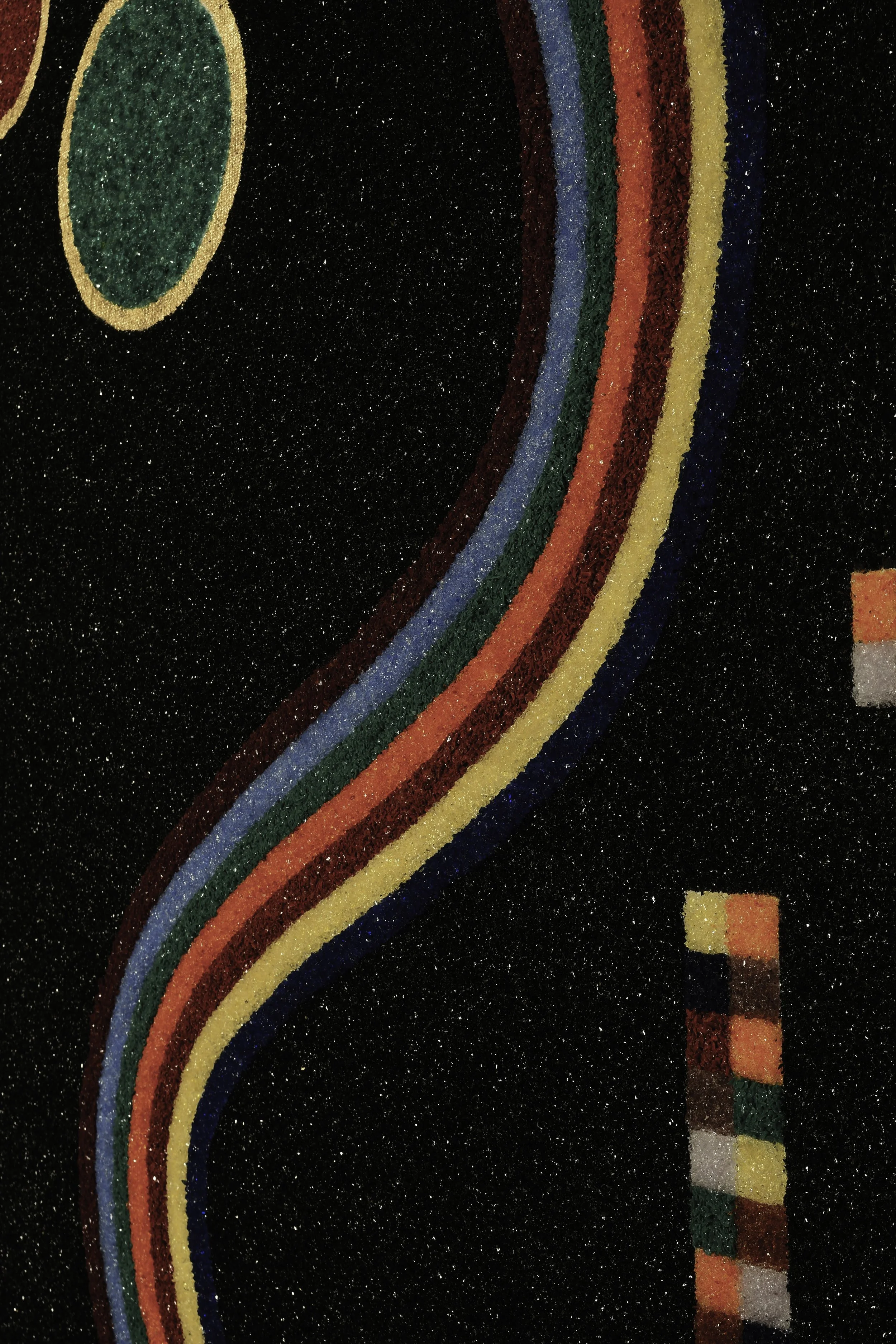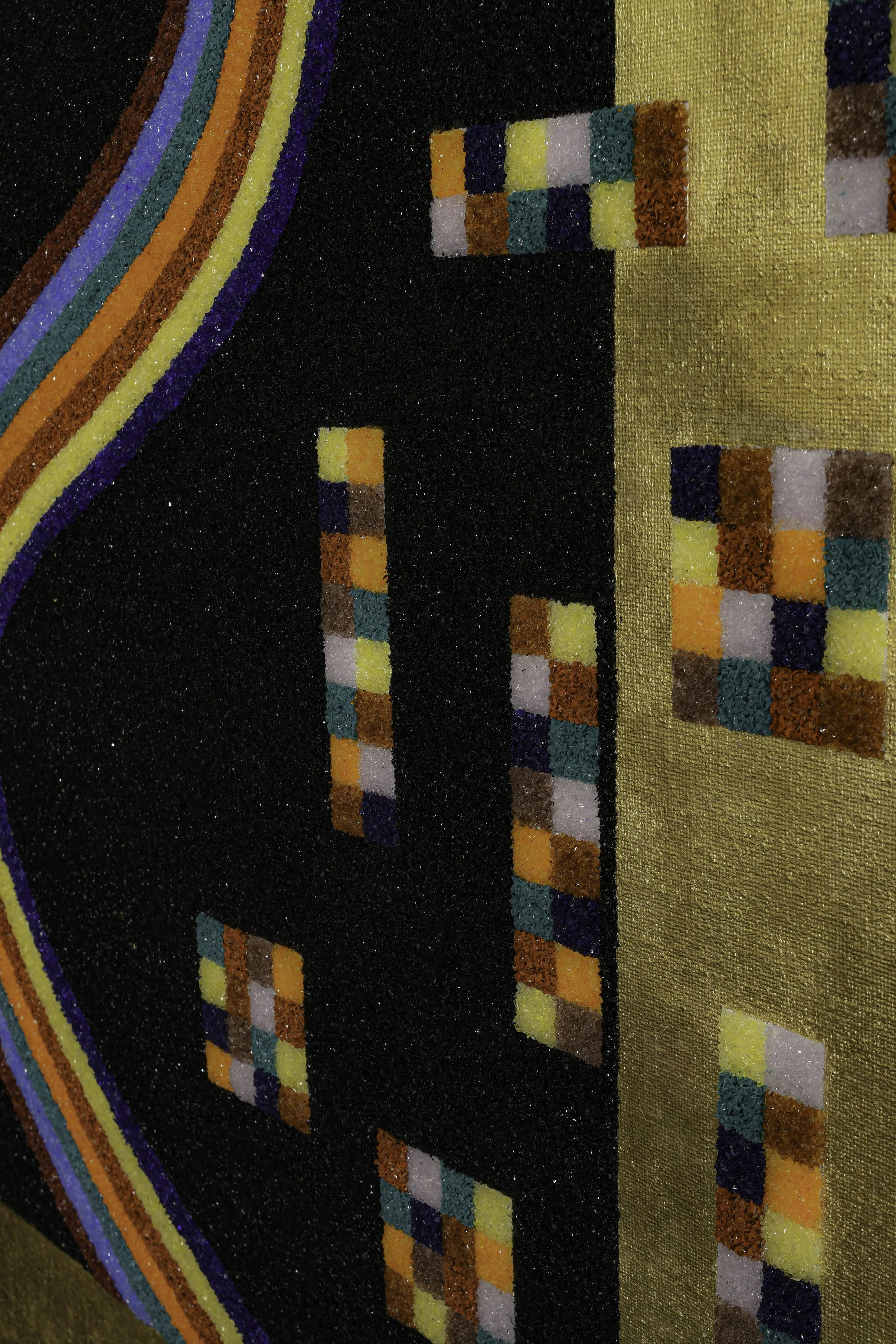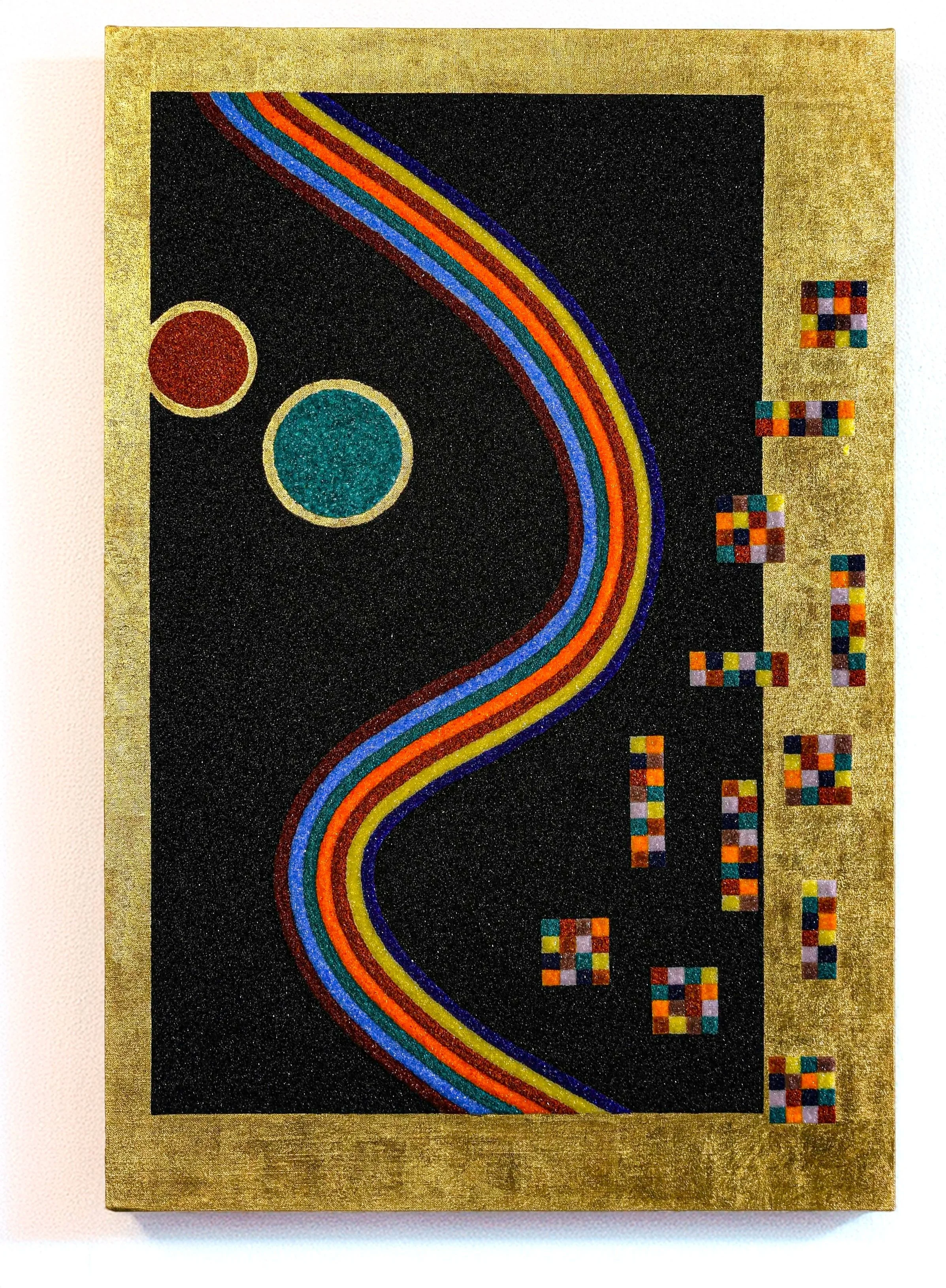 A luminous band of color moves through a dark crystalline field, bending gently across the surface before dissolving into a constellation of pixel-like forms. The work explores the dialogue between organic movement and digital structure — a flowing trajectory interrupted by fragments of ordered geometry. Built with layers of MicroCristallo Fusione, the surface interacts continuously with light, shifting between depth and reflection. The gold ground frames the composition like a field of illumination, reinforcing the tension between the infinite expanse of the dark plane and the precise fragments that emerge from it.
